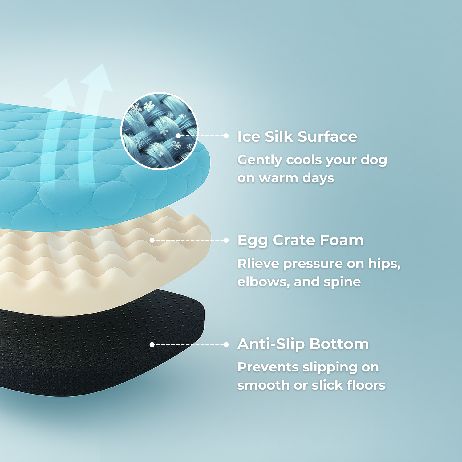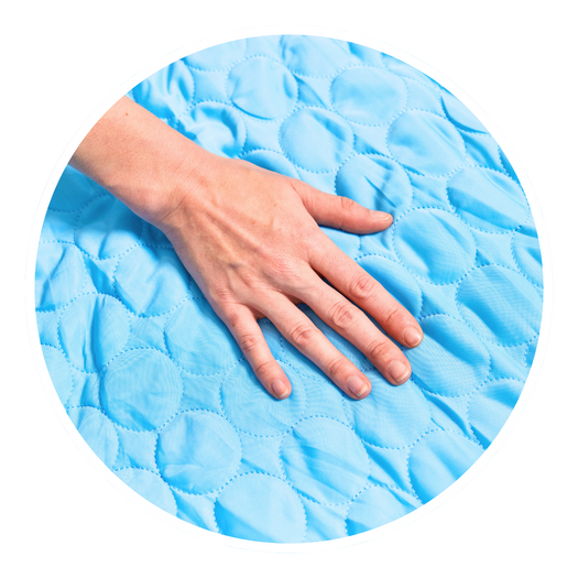 Ice silk fibers are hollow with a large surface area capable of absorbing moisture. When your dog’s body heat or moisture contacts the fibers, it quickly evaporates, carrying heat away and naturally lowering your dog’s temperature. This creates a reliable cooling effect that regulates their body temperature for a more comfortable, restful sleep.