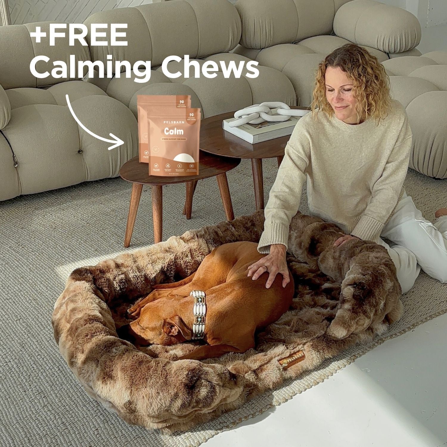 You will receive our Luxurious Orthopedic Bed plus a free pack of calming chews. This set supports your dog’s body with joint comfort and their mind with stress relief.